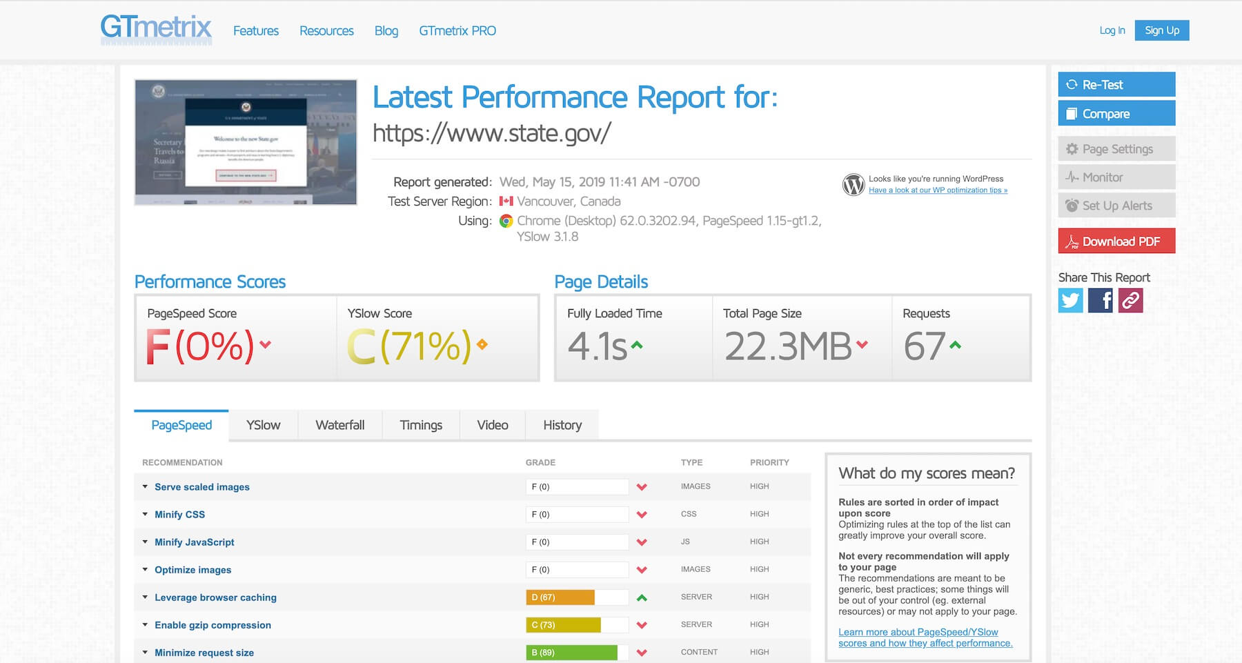 At the time of the writing of this article, was scoring a 0% on GtMetrix.com
